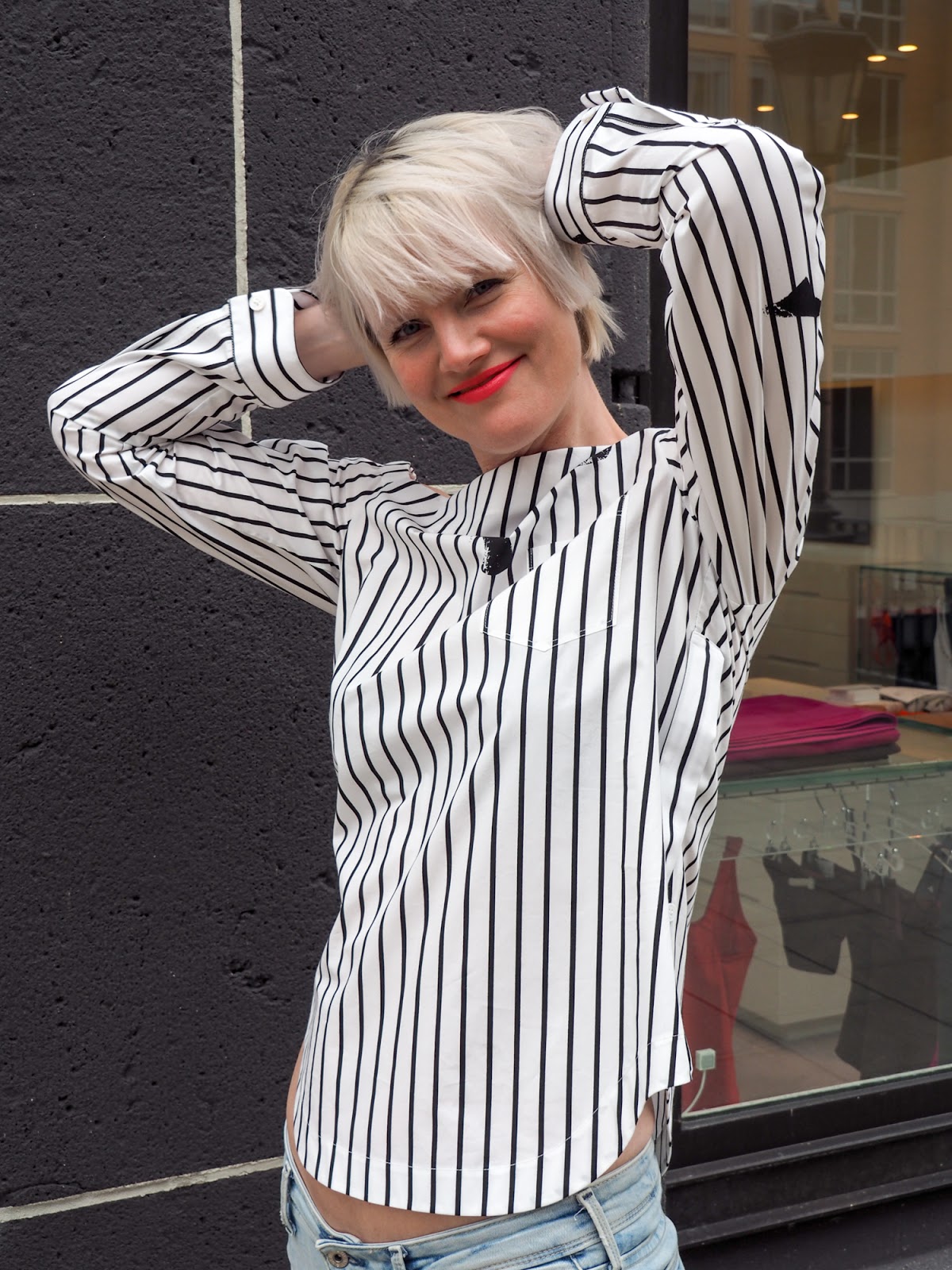 Dieses tolle Stück ist aus der aktuellen Jil Sander Kollektion. Besonders cool finde ich die Asymmetrie der Schulter, dem Style verfalle ich nur zu gern! Es wirkt sexy. Und so habe ich mich gleich mal hinein geworfen und das kleine Shooting voller Spaß genossen. Die Seitenpartie ist mit kleinen Knöpfen versehen. Das Material – feste Baumwolle. Das finde ich perfekt für den Frühling. Extrem transparente Blusen sind in Hamburg nicht so oft Einsatz tauglich, da man einfach darin friert, wenn der Nordwind tobt. Außer man zieht ein Longsleeve oder Rolli darunter. Aber mit der Asymmetrie ist der All-Over-Look ja eher nicht so möglich. Ich trage sie am liebsten wie sie ist. Auch ohne Jacke. Was sagt ihr zu diesem Look?